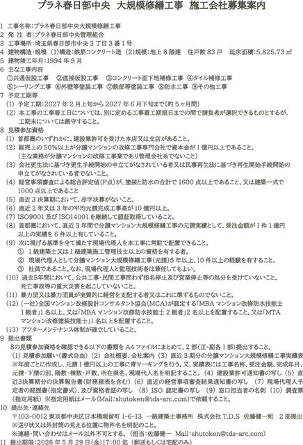 プラネ春日部中央管理組合は、大規模修繕工事の施工者を募集する。 =左欄に公告