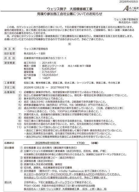ウェリス舞子管理組合は、大規模修繕工事の見積もり参加希望者を募集する。 =右欄に公告
