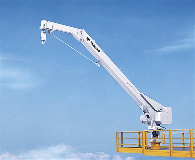 タダノは、ダビットクレーンと呼ばれる洋上風力発電設備向けのクレーンを開発した=写真。一般海域での着…