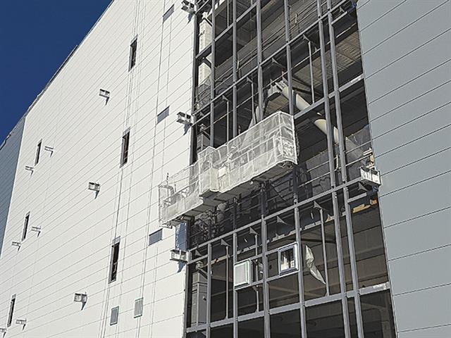 日綜産業は、千葉県富里市の現場で物流倉庫外装パネル揚げ重機ゴンドラシステム「P-UPシステム」を報…
