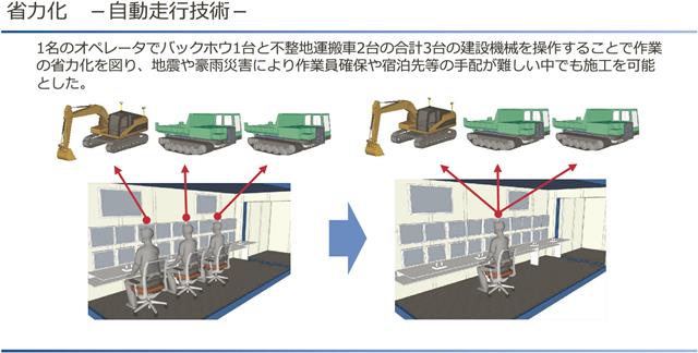 加えて、有人施工での夜間の土砂運搬作業は、暗闇により昼間よりも危険性が増すため、有人施工と無人化施工を時間帯で切り分けることで、「安全性と施工性を両立した施工体制を実現した」。