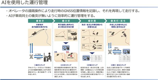 窮状を打破する切り札として導入したのが、同社開発の「ネットワーク対応型無人化施工システム」と「AI制御による不整地運搬車の自動走行技術」だった。