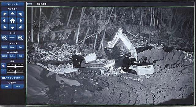 対応する建機は、遠隔操作式の0.8m3級バックホー(1台)と自動走行式のクローラダンプ(2台)。夜間の視認性を確保するため、同社として初めて暗視カメラを設置した。
