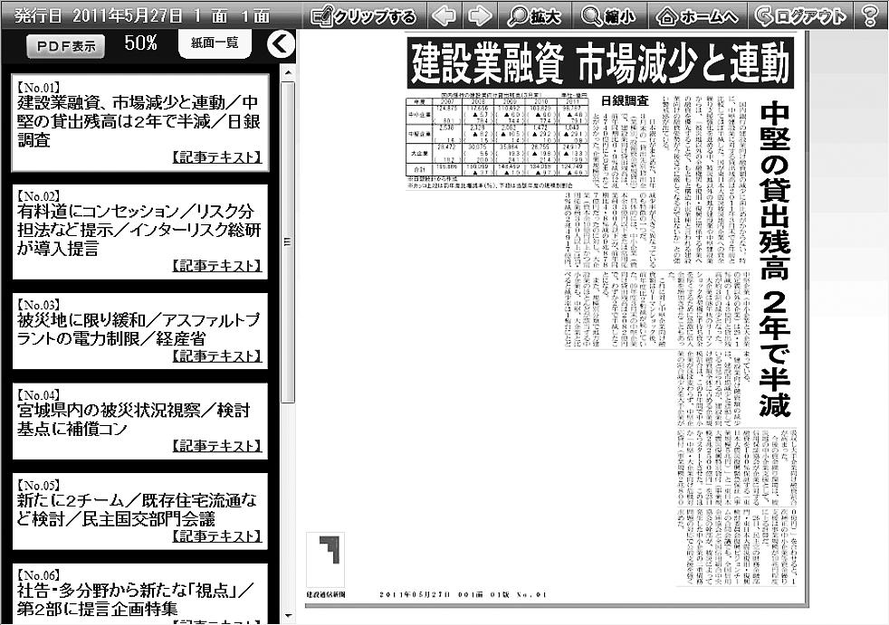 電子版画面イメージ。すべての記事はテキスト形式のほか切り抜き型式での表示、印刷が可能