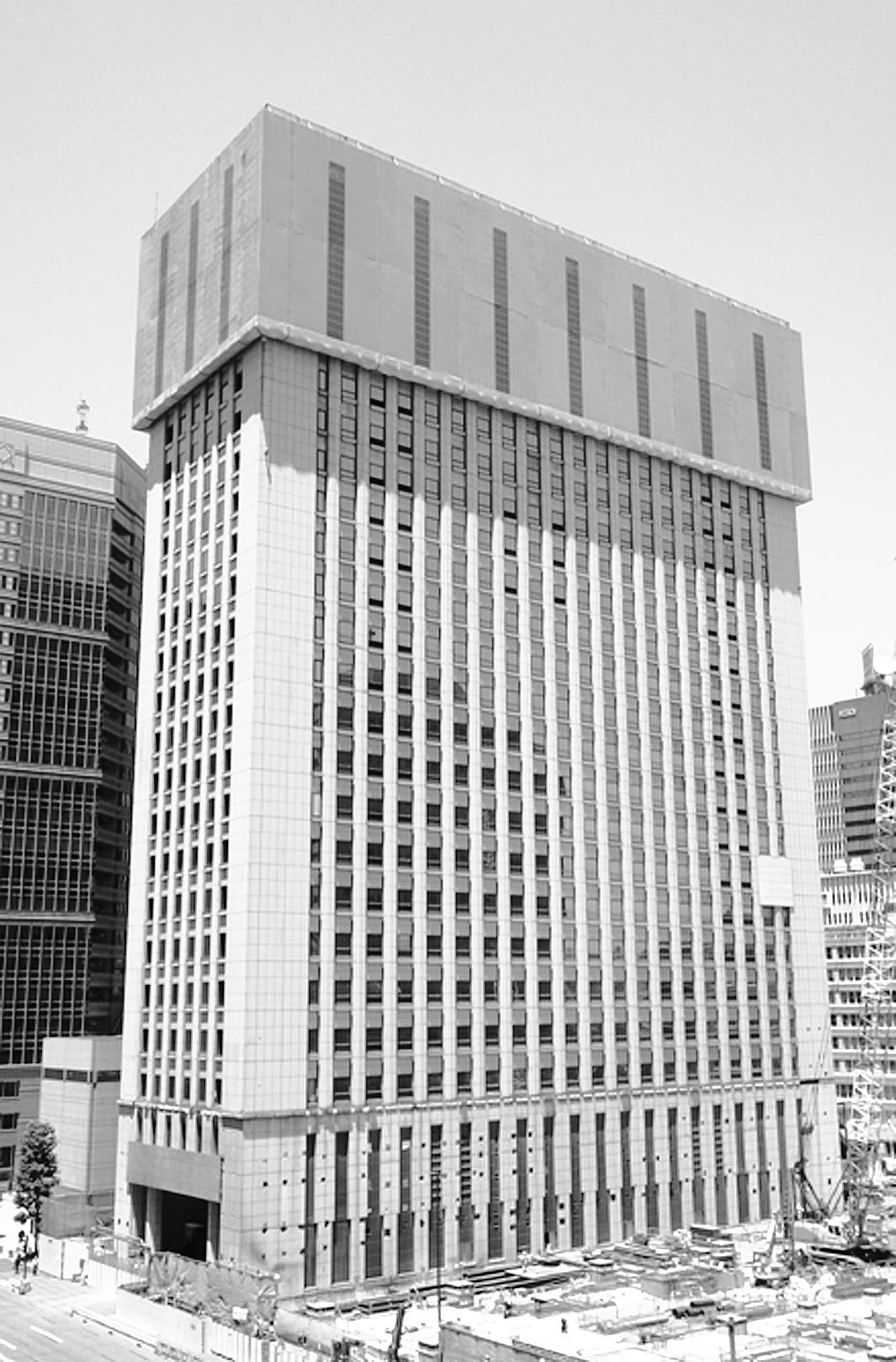 帽子をかぶせたような形で上部から躯体解体が始まった旧大手町フィナンシャルセンター