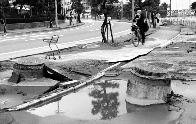 浦安市内では液状化の被害が広範囲に及んだ(3月15日撮影)