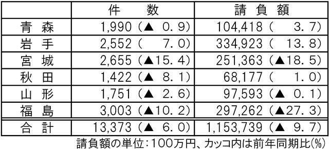 東保証宮城の8月末取扱い/請負額9.7%減1兆1537億