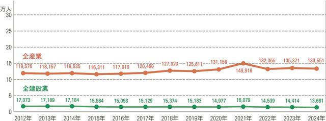労働災害の年別発生状況推移(2012-24年) 厚生労働省発表資料を参照して日本建設業連合会・調査資料より作成