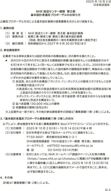 建替II期基本設計を公告/10月14日まで要綱、3月特定/NHK放送センター