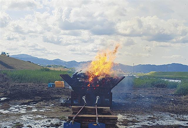 山辰組の「モヤッシー」/煙の発生抑え効率化/遠賀川河川敷で活用進む