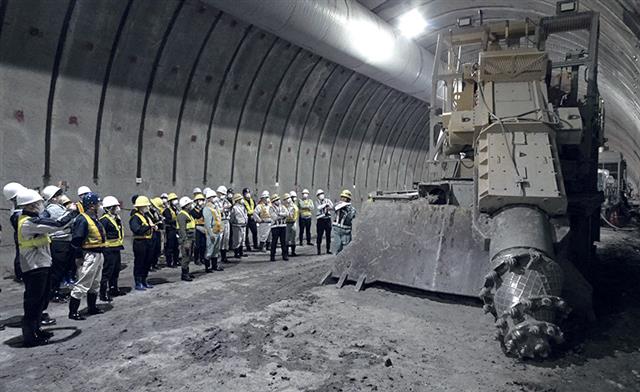 大型の自由断面掘削機を見学/秋田自動車道山内トンネル4車線化/トンネル専門協
