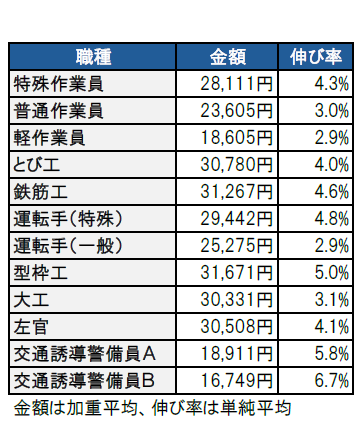 伸び率は、5%を上回った23―25年度と比べるとやや低くなった。調査で把握した最新の労働市場の実勢価格を踏まえて設定するため、直近3年と比べ技能者の賃金の伸びが弱くなったとみられる。