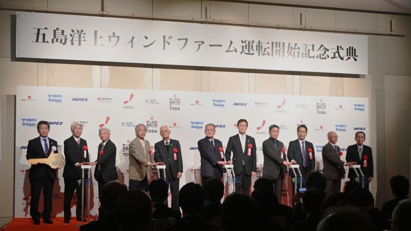 式典で、出口太五島市長は「洋上風力で発電した再生可能エネルギーを蓄える技術を確立したい」、石原宏高環境相は「海上の発電所という社会インフラの実装は、日本のものづくりの力を強く示す」と述べた。その後、大谷社長らが起動ボタンを押し、運転開始を祝った。