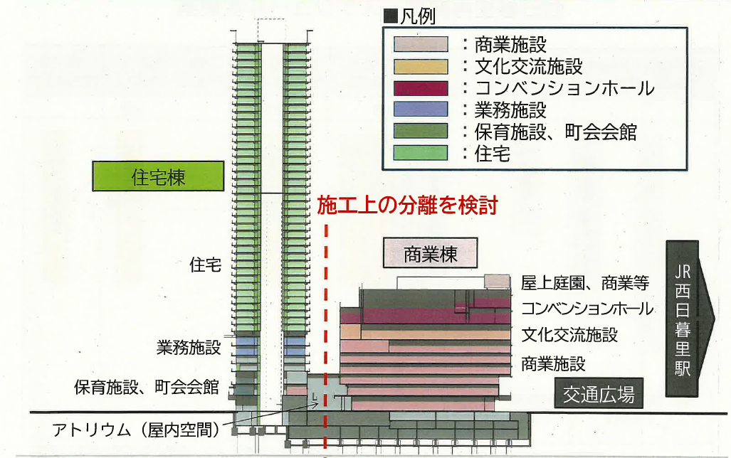 組合設立認可時の施設規模は、地下3階地上46階建て延べ約16万4150平方メートルで、高さ約170メートル。住宅、商業、業務、保育、文化交流施設、コンベンション施設などで構成する。施行地区は西日暮里5丁目の敷地約2・3ヘクタール。参加組合員として、東急不動産が参画し、事業コンサルタントは都市設計連合、基本設計は施設建築物を梓設計、公共施設を東急設計コンサルタントが担当している。