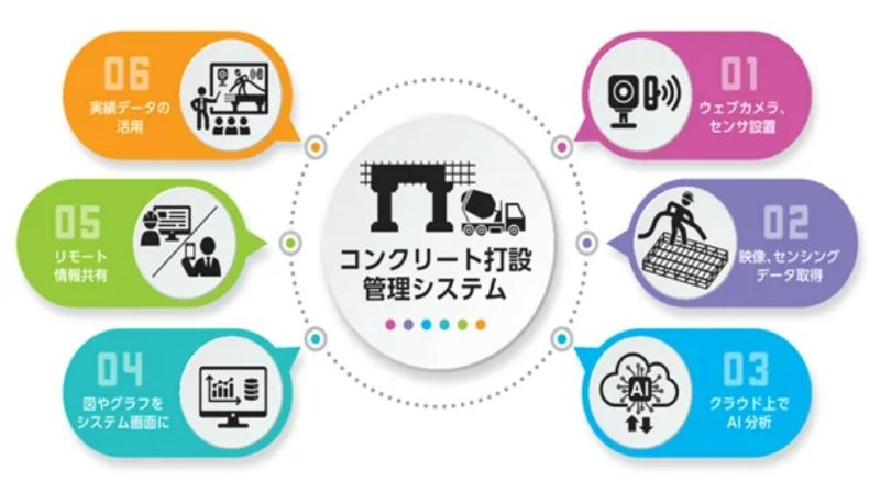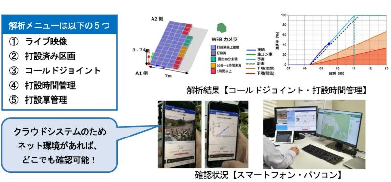 新システムは、熟練監督社員の減少や若年社員の経験不足による品質トラブルを未然に防ぐことを目的に開発した。現場に設置したWEBカメラや各種センサにより作業状況を記録し、クラウド上の管理システムで取得データのAI分析を実施。分析結果はグラフや図で可視化され、PCやタブレットなどのデバイスを通じてリアルタイムに確認できる。