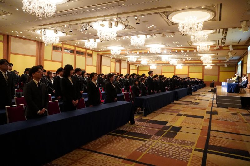 式典でずらりと並んだ新入社員。定刻を回ると、表情は一層引き締まる。名前を呼ばれて立ち上がったものの、弾みで頭が真っ白になったのか、しっかり覚えたであろうあいさつ文は、どうしても思い出せないようであった。かと思えば、式が終わると、どこからともなく始まる”非公式”の記念撮影会。ポーズをきめながら肩を寄せ合ってスマートフォンのレンズに納まる。その姿は、まだ若く、エネルギッシュだ。
