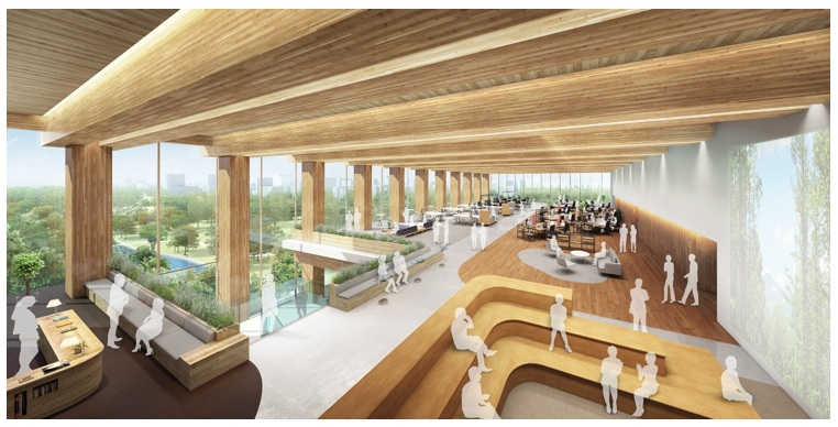 竹中工務店は、木材を使った鉄骨梁の耐火被覆技術「KiPLUS TAIKA for BEAM」で、3時間耐火の「国土交通大臣認定 耐火構造部材」を取得した。建築基準法上の階数制限がなくなり、従来は不可能だった15階以上の建物でも耐火性能を確保できるようになった。また、設備配管を通す貫通孔は、一般的なS造と同等の大きさのものを設置できるようになり、建築・設備計画を制限せずに、木による快適性の高い空間を実現する。
