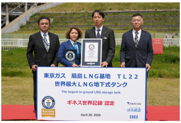 清水建設とIHIプラントが施工した東京ガス扇島LNG基地(横浜市)の4号地下式LNGタンク(容量25万立方メートル)が「世界最大の地下式LNGタンク」としてギネス世界記録の認定を取得した。20日に現地で認定証贈呈式が開かれた。