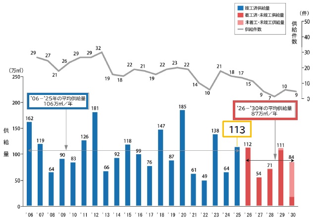 今後5年間の各年の供給量見通しは、建設費高騰前着工物件が残っており26年はまだ前年並みの112万平方メートルとなるが、27年からは54万平方メートルに落ち込み、28年が71万平方メートル、29年が111万平方メートル、30年が84万平方メートルと推移する。過去20年間の平均106万平方メートルの77%ほどで、建設費高騰による計画見直しや中止、工期延長などの影響が顕在化する期間となる。
