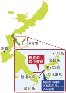 老若男女がバケツやざるを使って石を運ぶ工事は61年3月に着手。道路は平安座島から本島側の藪地島へ向かって日ごとに延び、島民は完成を夢見て希望に胸を膨らませた。延長800mに達したが、同年7月と9月に上陸した台風で海中道路はもろくも波にのまれて押し流された。