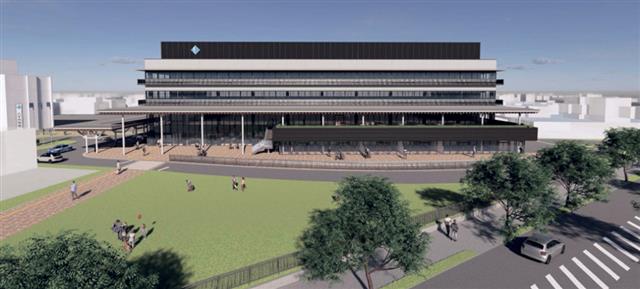 新庁舎の規模はS造5階建て延べ1万3433㎡。基礎免震と制振構造を採用する。ZEB(ネット・ゼロ・エネルギー・ビル)Readyの認証取得を目指す。