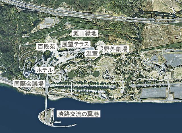報告書によると、ホテル・展望テラス(面積4.7ha)、国際会議場(同3.4ha)は土地と建物を一体で民間に譲渡する。百段苑(同3.5ha)、温室・野外劇場灘山緑地(同2.5ha)、淡路交流の翼港(同1.8ha)は指定管理制度で管理運営する。