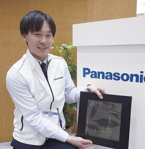 脱炭素化に向けて注目される再生可能エネルギー。とりわけ注目を集めるのがペロブスカイト太陽電池だ。パナソニック環境エンジニアリングは、この分野の国内先頭集団の一角で、会場には開発中の「ガラス型ペロブスカイト太陽電池」を展示した。持ち株会社のパナソニック、AGCと3社協働で取り組んでおり、現場実証も始まっている。
