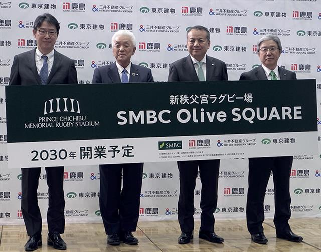 鹿島を代表企業とし、三井不動産、東京建物、東京ドームの4社で構成する「秩父宮ラグビー場株式会社」は12日、3日に着工した新秩父宮ラグビー場の着工セレモニーを東京都新宿区の現地で開いた。ラグビー場の名はそのまま継承しつつ、トップパートナーとして三井住友フィナンシャルグループを迎え、スタジアムの副名称を「SMBC Olive SQUARE」とする。2030年の開業を目指す。