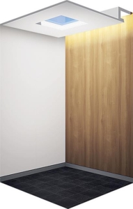 展示では、Ville-feuilleのほかにも利用者の快適性を追求するさまざまな製品やサービスを紹介する。「快適空間エレベーター」は、視覚と聴覚に訴える機能を組み合わせ、乗車時間の快適性向上を目的としたエレベーターとなる。外の採光が難しいエレベーターに、時間に応じた空の表情を表現する「青空照明misola(みそら)」を搭載し、明け方の空、昼の青空、夕焼けなどを再現する。