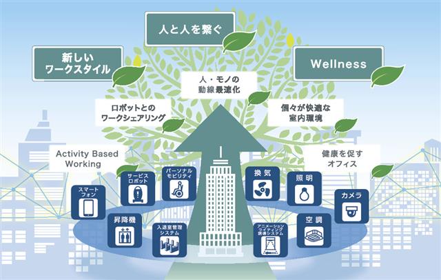 同社は『Smart Building Solution(スマートビルディングソリューション)』をテーマに、業界トップシェアを誇るエレベーターや入退室管理システムなどを掛け合わせた独自のスマートビルソリューションを加速している。設備データのプラットフォームに同社の開発したビルOSの「Ville-feuille」を活用し、さまざまな設備機器と連携してビル就業者の利便性、快適性、省エネの向上、業務効率化に役立つサービスを提供する。