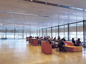 次にロビーへと入っていくと、日本建築のひさしの下にいるような感覚を覚える。室内にもかかわらずこのように感じられるのは、鉄骨柱の細さでガラス壁の透明感が際立って見えるためだろう。その効果で外装の木ルーバーが引き立ち、まるでひさしの下のような印象を与えるのだ。ロビー脇のカフェのガラス壁は開け放すことができ、文字どおり“ひさし”空間に転換することもできる。