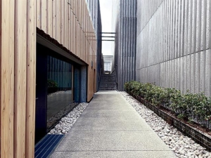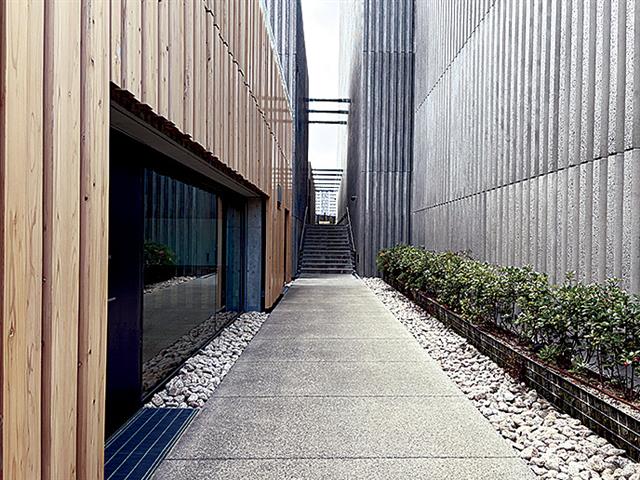 “小さい劇場”にする上で、建物高さを抑えることに加え、「分節」にもこだわった。建物を小さく分けたことで生まれた建物と建物の間の“隙間”は、“日常性”の一要素でもある。というのも、対象地はもともと公園で散策路として親しまれてきた。だからこそ、通り抜けたり、散策したりと公園を歩くような使われ方を意識したのだ。実際に、近隣の学生が通学時に通り抜け、それをきっかけにふらっと立ち寄っていく、そうした日常が生まれている。