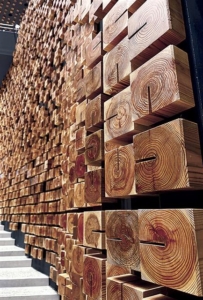 外装と同様、内部にも木ルーバーが多用されているが、同じ木でも使用する部位は異なる。耐候性が強い丸太中心部の赤太(アカタ)を外装、丸太表皮に近く、不燃の薬剤が含浸しやすい白太(シラタ)を室内へと、適材適所で使用することにより、木を無駄なく使った。